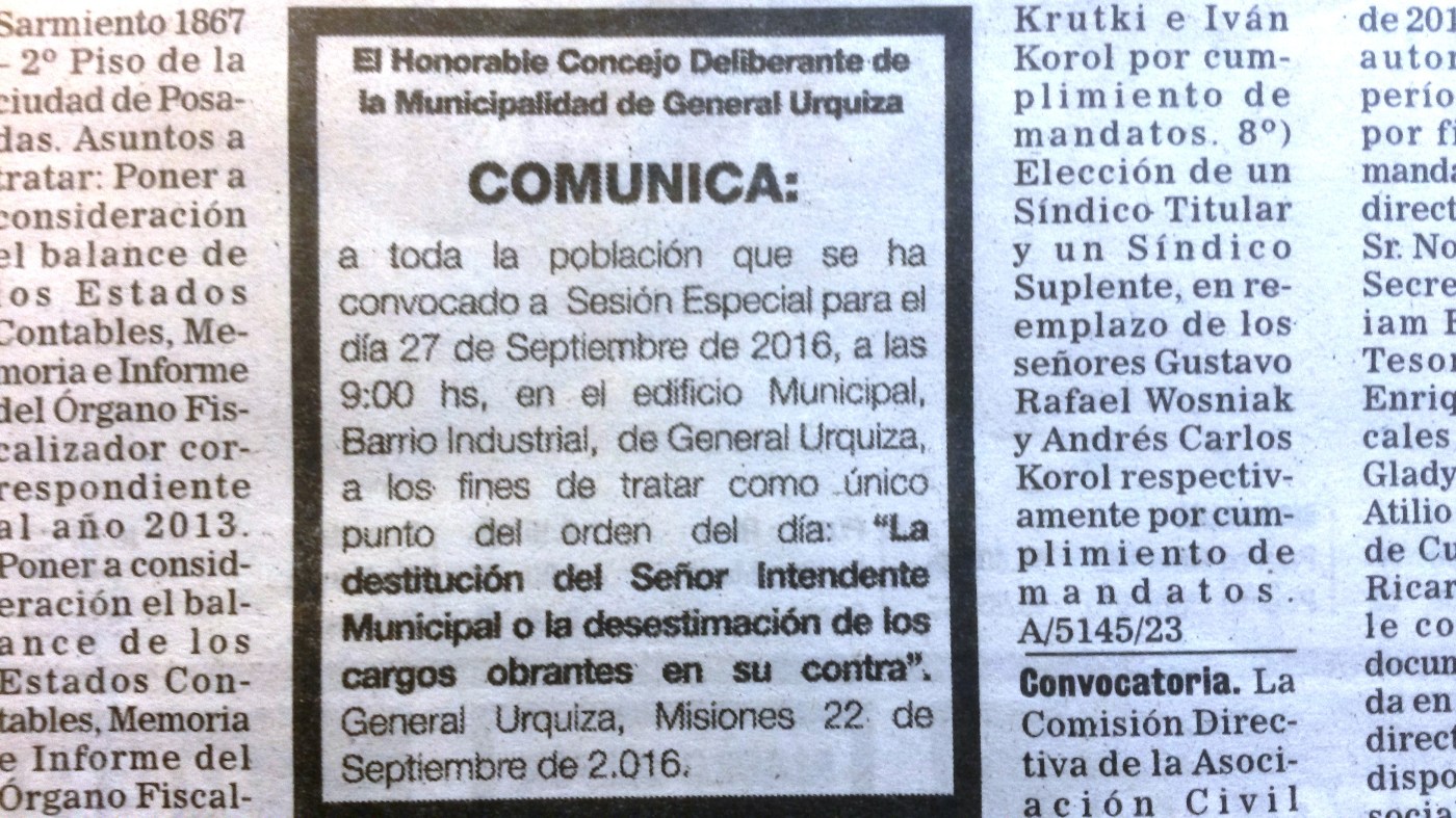De todas maneras y en medio de este contexto, el Concejo Deliberante de General Urquiza publicó el 22 de septiembre el edicto en diarios de Misiones donde comunican a la población que convocaron a Sesión Especial para el día 27 de septiembre de 2016, a las 9 horas, en el edificio Municipal del barrio Industrial de General Urquiza, “a los fines de tratar como único punto de la Orden del Día la destitución del señor Intendente Municipal o la desestimación de los cargos obrantes en su contra”.