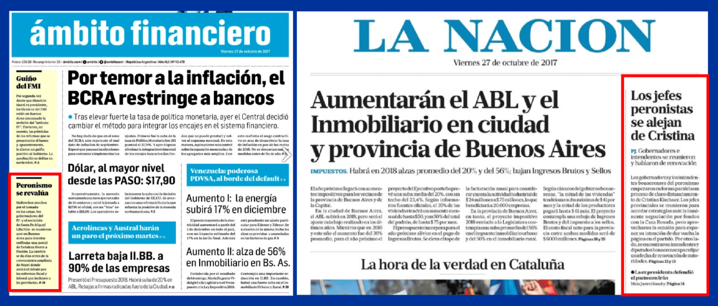 Los otros dos matutinos que valoran políticamente la reunión para darle espacio, aunque sea en una llamada, en la tapa, son El Cronista y La Prensa. Son los que más se ajustan a la información sin sesgarla a una cuestión peronista. El Cronista titula: “Los gobernadores fijaron una estrategia común para discutir los fondos de 2018. Se reunieron 18 mandatarios, vices y ministros para acordar una postura conjunta de cara a la discusión del Presupuesto, Fondo del Conurbano, ATN y los PPP”. En la redacción se vale de una información precisa para deslizar la cuestión política. Anuncia como novedad que se invitarán a la reunión prevista con Macri a Marco Lavagna, del Frente Renovador, y a Diego Bossio, del bloque Justicialista. “Cuando El Cronista preguntó si también iban a llamar a la reunión a Axel Kicillof, encontró negativa de parte de los consultados. «No se habló de llamar a Axel», señaló un ministro”. La Prensa que en la tapa cae en el desliz de considerar que son “los gobernadores peronistas”, en el interior de la nota apunta como ningún otro medio a lo subyacente en la movida de los gobernadores cuando resacara declaraciones del gobernador de Córdoba cuando enfatiza «queremos participar de este nuevo ordenamiento socioeconómico, para que sea de generación de empleo genuino y baja de la pobreza e inflación”. También cuando revela que los gobernadores insistieron en advertir sobre la concentración de fondos crecientes en Nación y decrecientes en las provincias” Y da en la clave cuando afirma que “la reunión tuvo como objetivo establecer un «planteo institucional» para llevar a la reunión con Macri, aunque sin «afectar el diálogo» con el poder central.