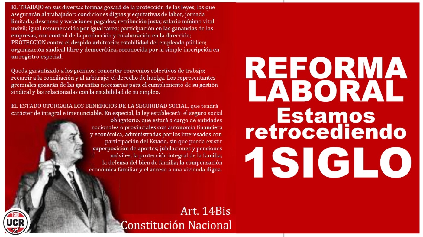 Se conocieron esta semana declaraciones del presidente de la Convención Nacional de la UCR, Jorge Sappia. Sostiene: “Que mis correligionarios tomen nota de la historia del radicalismo y voten como corresponde. Y si no, que se vistan de amarillo. Estamos retrocediendo un siglo con lo que están proponiendo con esta reforma que tiene 2 caras: una referida a asuntos necesarios a abordar y otra cara es la aparición de intenciones que colocan el derecho del trabajo antes de la constitución de la Organización Internacional del Trabajo en 1919.