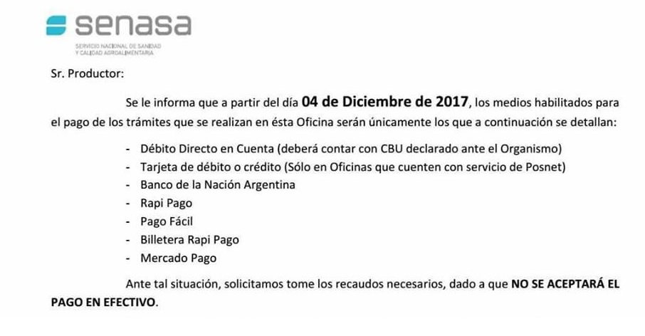 «Es que de acuerdo a esta resolución, los productores que no tengan una CBU asociada al sistema electrónico del SENASA, tendrán que concurrir a la oficina local a iniciar el trámite, y luego con la boleta de pago concurrir al Banco Nación o a un Rapipago a abonar la misma para, posteriormente, con dicha constancia de pago, nuevamente ir a la oficina del SENASA para retirar la documentación correspondiente y poder así habilitar el traslado de animales.