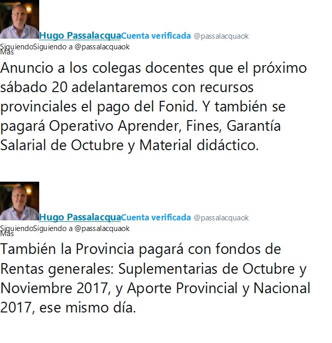 “Anuncio a los colegas docentes que el sábado 20 adelantaremos con recursos provinciales el pago del Fonid. Y también se pagará Operativo Aprender, Fines, Garantía Salarial de Octubre y Material didáctico” anunció el Hugo Passalacqua a través de su cuenta de Twitter. “También la Provincia pagará con fondos de Rentas generales: Suplementarias de Octubre y Noviembre 2017, y Aporte Provincial y Nacional 2017”, agregó el mandatario.