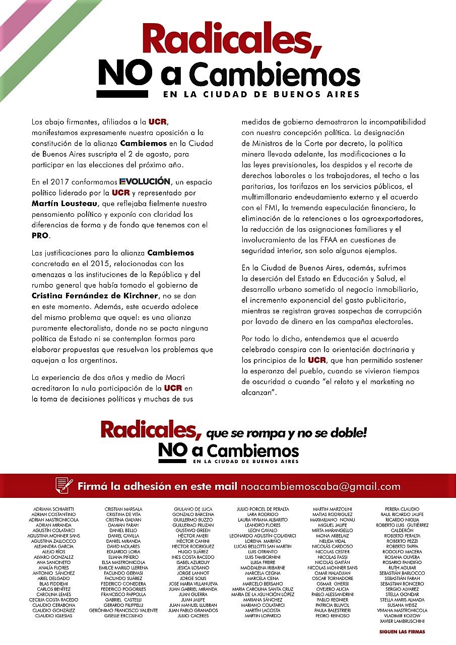 El documnto expresa textualmente: “Los abajo firmantes, afiliados o lo UCR, manifestamos expresamente nuestra oposición o lo constitución de lo alianza Cambiemos en lo Ciudad de Buenos Aires suscripto el 2 de agosto, paro participar en los elecciones del próximo año.