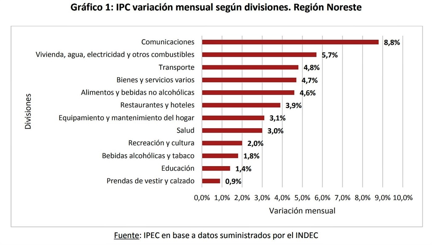 En agosto el IPC en la región noreste aumentó el 4,0% por el encima del nivel general a nivel nacional que aumentó un 3,9% respecto al mes anterior, según informó el IPEC. El índice que más le aumentó al consumidor es la división comunicaciones con un 8,8%; le sigue vivienda, agua, electricidad y otros combustibles con un 5,7% que en un año acumula aumentos por 54% por los tarifazos. El transporte que en el mes subió 4,8% lleva acumulado 48,5% en 12 meses.
