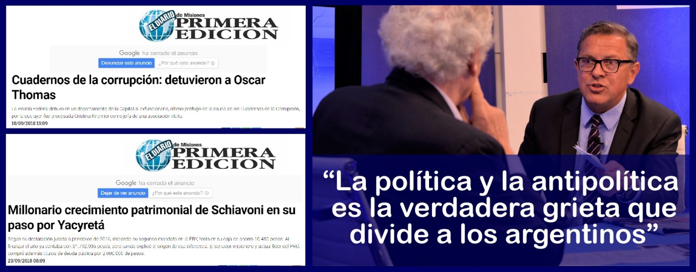 El referente alfonsinista de Misiones, viene poniendo énfasis en desnudar la prédica del poder hegemónico de desprestigio de la dirigencia política que, enancada en las denuncias de corrupción, pretende debilitar los partidos y las organizaciones populares. En oportunidad de conocerse una encuesta del Grupo de Opinión Pública, que revelaba que todos los políticos argentinos tienen más imagen negativa que positiva de acuerdo con un estudio divulgado a fines de julio, Escalada destacó que la evaluación es producto de una prédica del poder real en contra de la política como herramienta de organización de la sociedad y del Estado. Afirmaba entonces que “ahí está la verdadera grieta: entre la política y la antipolítica” (ver nota 26 de julio: “La política y a anti-política es la verdadera grieta de los argentinos”.