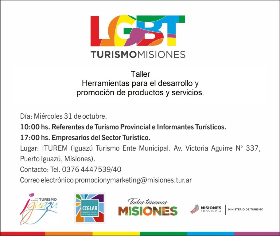 Posadas (Martes 30 de octubre). Los talleres de sensibilización sobre diversidad sexual y de género para el sector turístico tendrán lugar este miércoles 31 en Puerto Iguazú, organizado en forma conjunta entre el Ministerio de Turismo de Misiones y la Cámara de Comercio Gay Lésbica Argentina (CCGLAR).