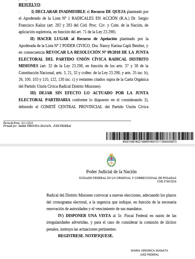 Posadas (Sábado, 10 de octubre) La Justicia Federal hizo caer la proclamación de Martín Arjol como presidente de la UCR Misiones y todos los candidatos del oficialismo que se postulaban para ocupar cargos partidarios a partir del 1° de enero de 2019, entre ellos Hernán Damiani al comité de Posadas. La jueza María Verónica Skanata, con competencia electoral, falló haciendo lugar al recurso de apelación planteado por la apoderada de la Lista 2, Poder Cívico, Nancy Karina Capli Benítez, lista que postula a Federico Villagra como candidato a presidente del comité provincia.