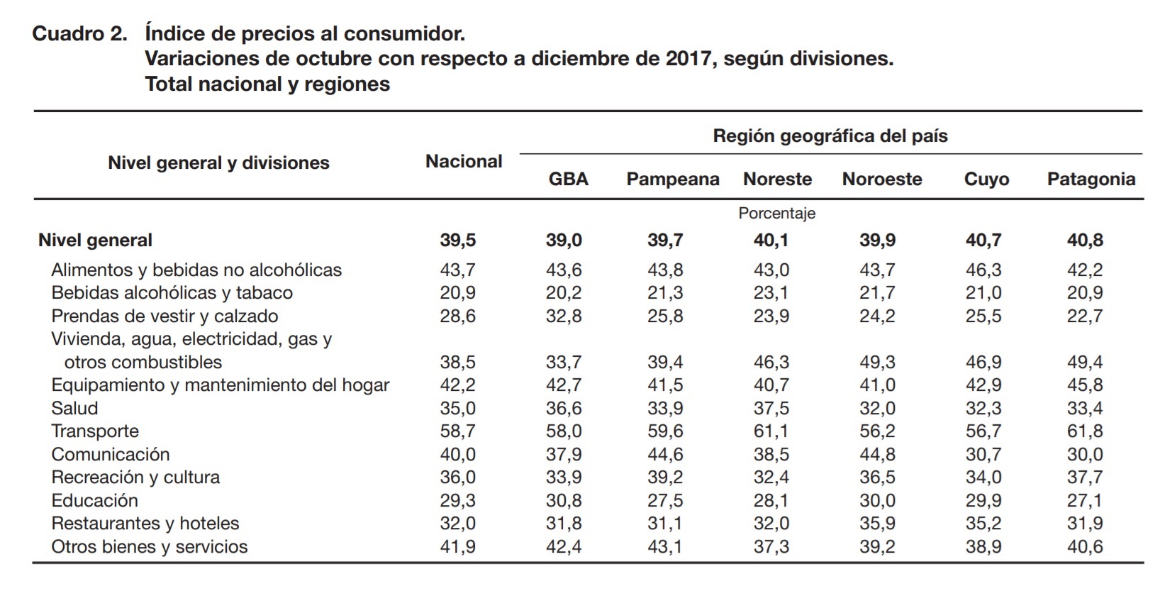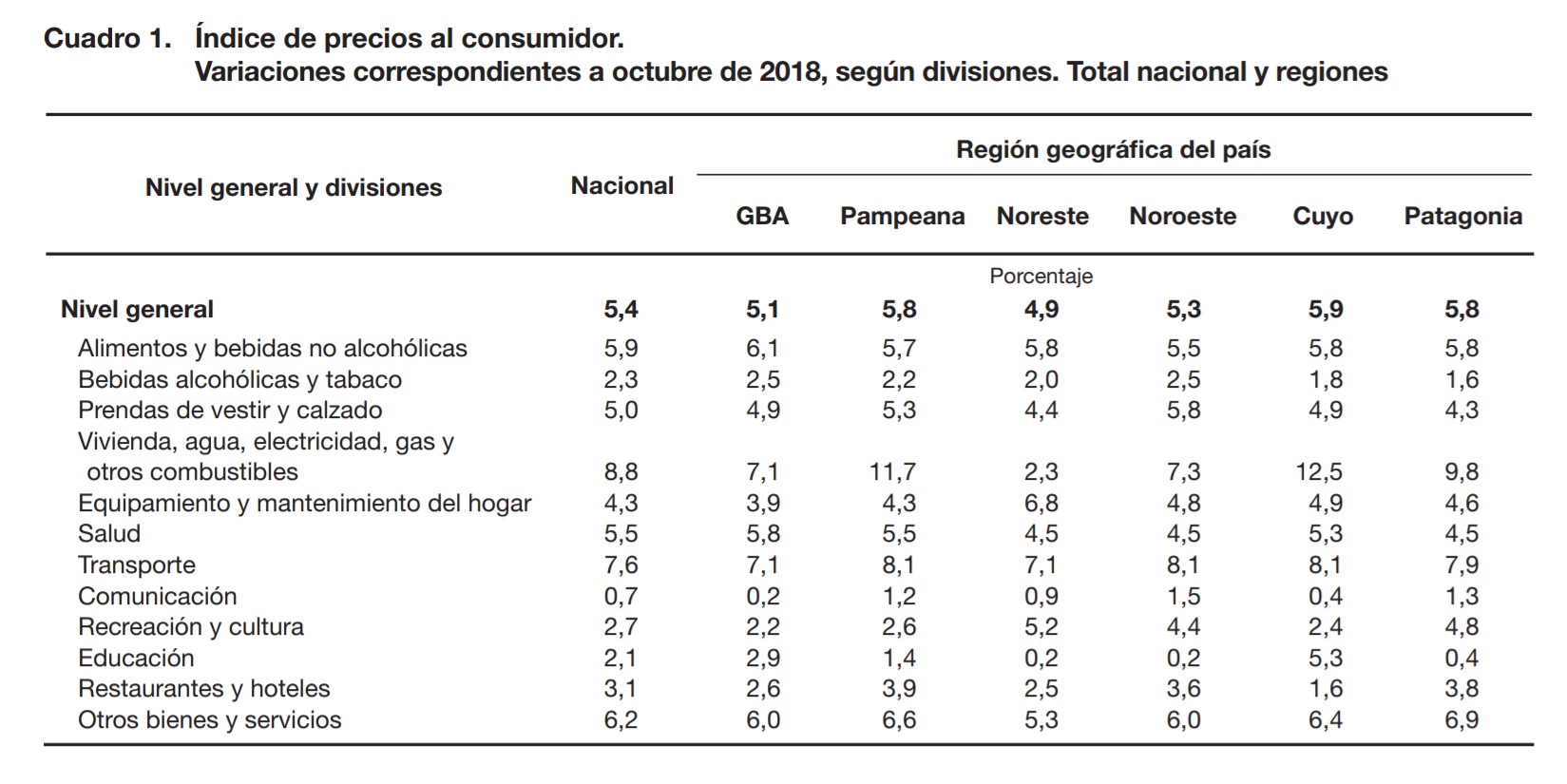 El informe del Instituto Nacional de Estadística y Censos no discrimina por provincia sino por región. Lo que más aumentó en el mes es el rubro Trasporte con una suba del 7,1% y los servicios de electricidad, agua y gas con un incremento del 6,8%. Son los rubros que también registran los mayores incrementos en los diez primeros meses del año, el trasporte supera el 56% y los servicios el 49%. Alimentos y bebidas no alcohólicas registra un índice del 43,7%