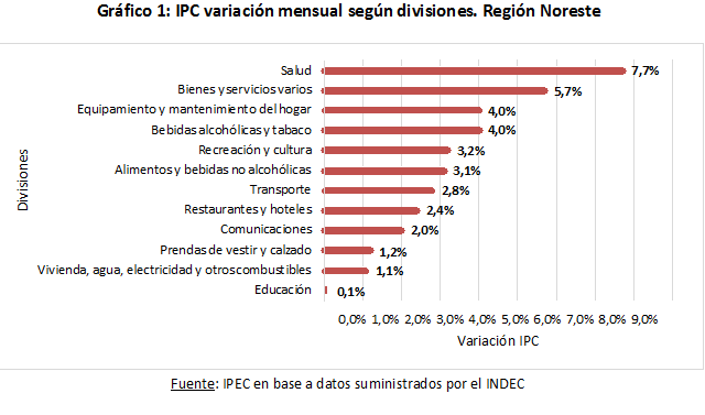 En cuanto al IPC por categorías, el que presenta mayor incremento tanto a nivel nacional como regional es el IPC de bienes regulados, con un 63,2% y 61,6% respectivamente. Le sigue el IPC núcleo con un incremento del 46,2% a nivel nacional y del 46,6% en la Región NEA; finalmente el IPC de bienes estacionales aumentó un 33,8% a nivel nacional y 30,1% en la región.