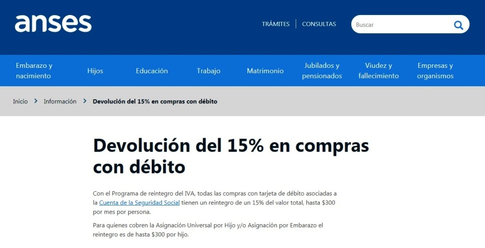 Con el Programa de reintegro del IVA, todas las compras con tarjeta de débito asociadas a la Cuenta de la Seguridad Social tienen un reintegro de un 15 por ciento del valor total, hasta 300 pesos por mes por persona. Para quienes cobren la Asignación Universal por Hijo y/o Asignación por Embarazo el reintegro es de hasta 300 pesos por hijo.