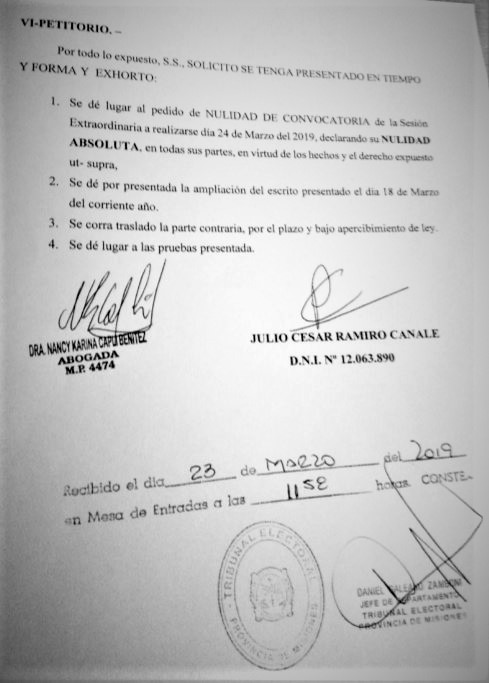 En el día de la fecha la apoderada del Convencional de la UCR Ramiro Canale, la Dra Karina Capli Benítez presentaron ante el Tribunal electoral un escrito ampliando su presentación del día 18 de marzo y solicitando la Nulidad de Convocatoria de la Convención del día 24 de Marzo.