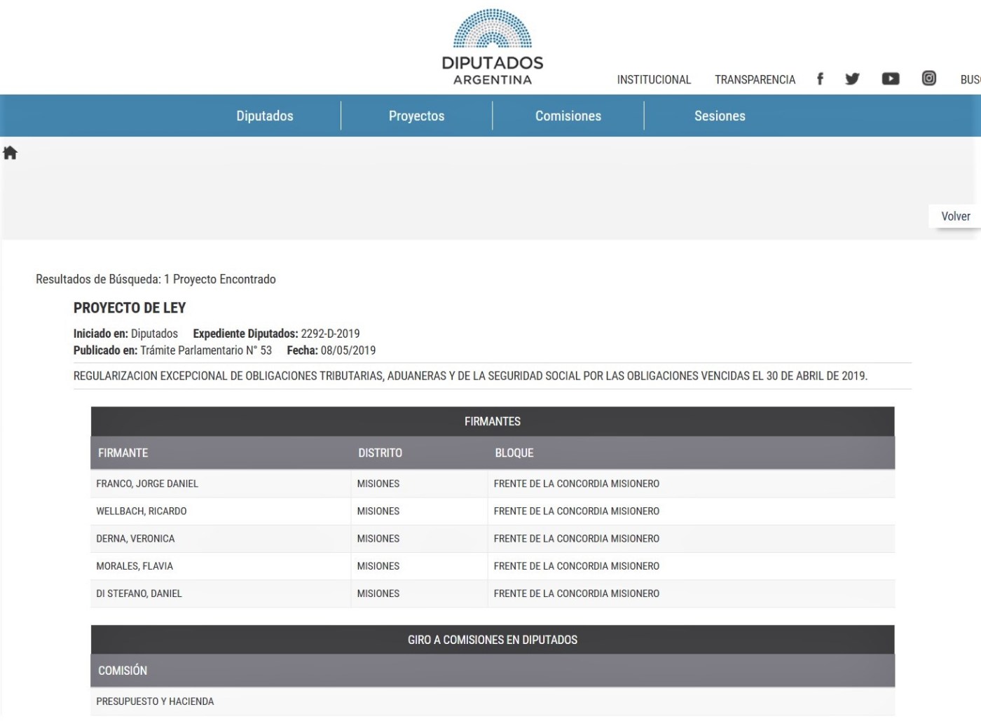 Viernes, 24 de mayo de 2019. Con la firma de Jorge Franco en su rol de presidente y la de todos los integrantes del Bloque Frente de la Concordia Misionero, tomó estado parlamentario en Diputados el proyecto de Ley que busca una amplia moratoria impositiva. El objetivo de la misma es brindar a las empresas y contribuyentes en general la posibilidad de regularizar su situación ante el fisco nacional. En los fundamentos del mismo se pone como centro a la crisis económica que está atravesando el país, la que obligó a muchos contribuyentes a caer en incumplimientos tributarios y que hoy se encuentran condicionados por procesos administrativos. La norma propone disponer con alcance general la exención parcial de los intereses resarcitorios y/o punitorios, así también como las multas y demás sanciones emergentes de obligaciones tributarias y de los recursos de la seguridad social.