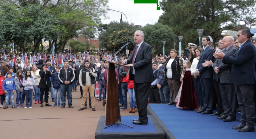 En los discursos que siguieron a los rituales del acto patrio, tanto la docente de la escuela nocturna N° 15, Marta Ofelia Salina, como el intendente local Valdomiro Dos Santos y el mismo gobernador Passalacqua mencionaron los momentos difíciles que atraviesa el país y mencionaron como elemento distintivo y necesario para estas horas, la “unidad” de todos.
