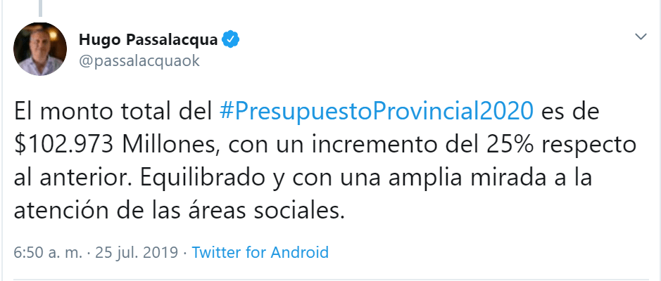 El Gobernador envió al Poder Legislativo el proyecto de presupuesto de la provincia para el año 2020. Prevé un incremento del 25 porciento con respecto al que se encuentra en ejecución y la inversión en las áreas sociales asciende a casi el 60 por ciento. Fue anunciado por Hugo Passalacqua a través de su cuenta de twitter.