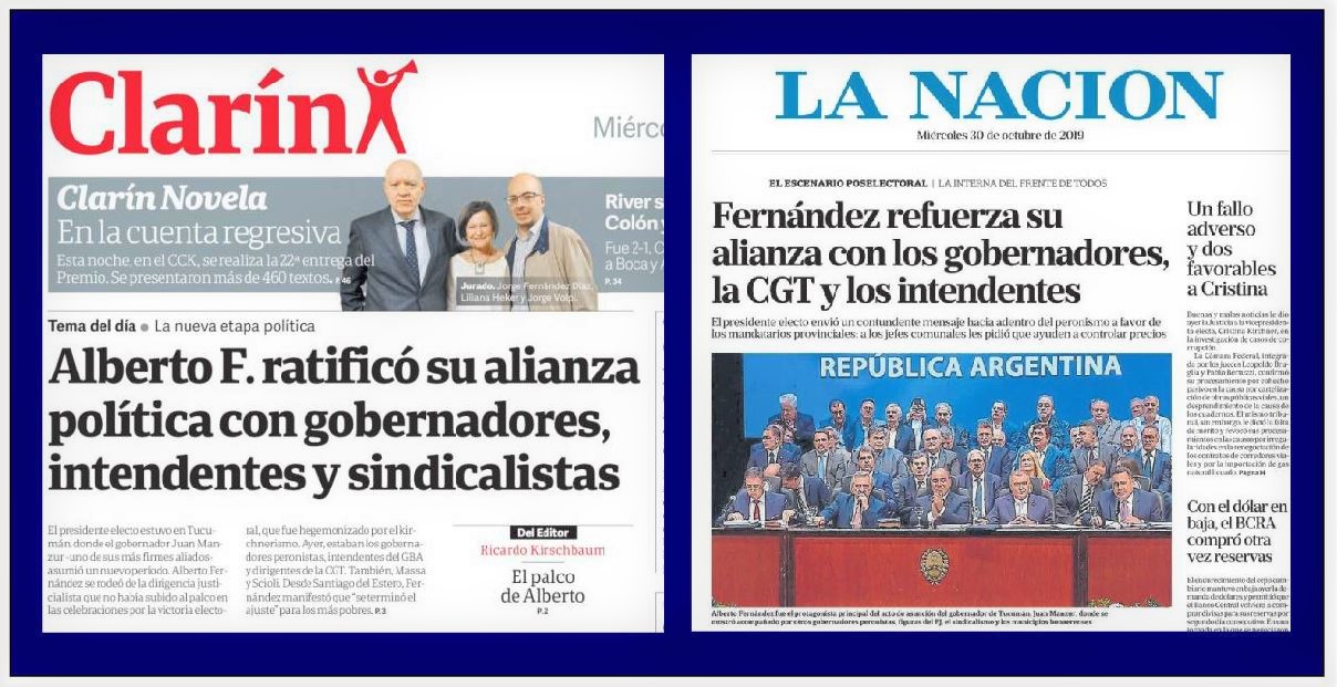 En los dos diarios se pone la lupa sobre la construcción del poder. Sostienen que la «foto política» del acto del martes de Alberto Fernández en Tucumán fue muy distinta a la del domingo pasado por la noche durante los festejos de su triunfo en las elecciones, que lo convirtieron en el sucesor de Mauricio Macri. En el escenario se mostró junto a gobernadores peronistas, sindicalistas e intendentes del conurbano, que quedaron relegados del escenario en la celebración por el resultado de las presidenciales.