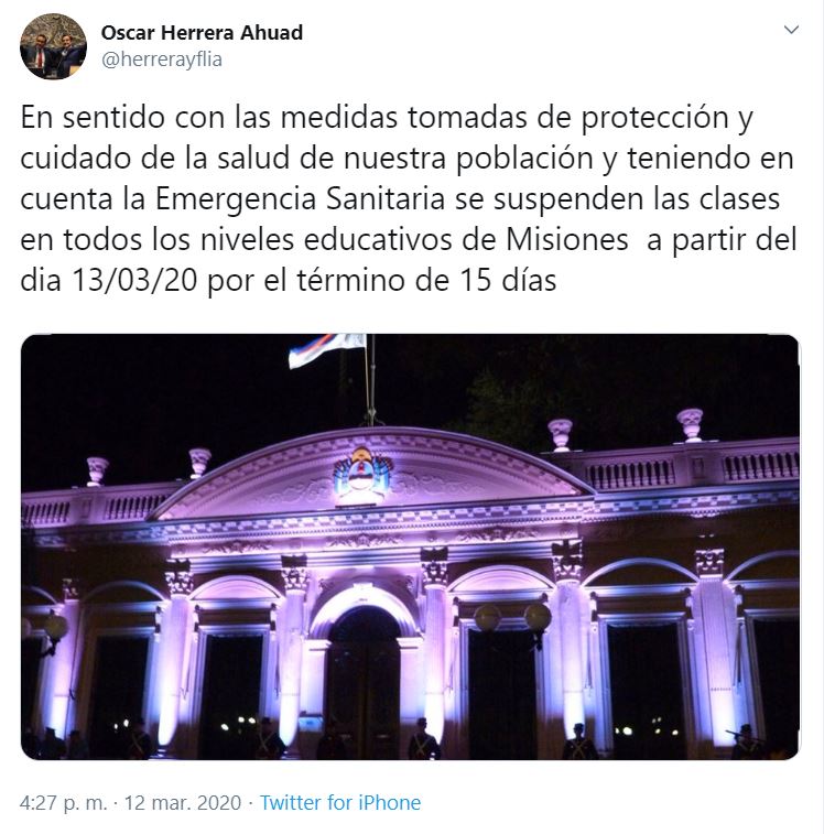 Jueves, 12 de marzo de 2020. El Gobernador anunció que Misiones suspende las clases en todos los niveles educativos por el lapso de 15 días, a partir del viernes 13 de marzo. La medida anunciada, a través de la cuenta oficial de twitter del mandatario, está en línea con Emergencia Sanitaria decretada. La decisión de suspender las actividades escolares viene a consolidarse como medida sanitaria preventiva ante el brote de Dengue por el que transita la provincia y la amenaza que representa la pandemia de coronavirus. Se dispondrán herramientas pedagógicas digitales para enfrentar la contingencia, hasta el 30 de marzo que será el día de la vuelta a clases.