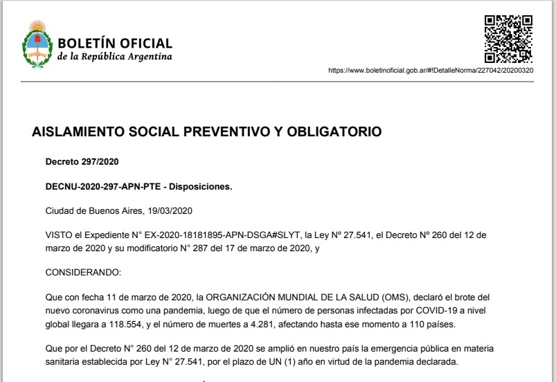 Viernes 20 de marzo de 2020. El Decreto de Necesidad y Urgencia 297/2020 que ordena el aislamiento preventivo y obligatorio tiene catorce Artículos y siete páginas, establece además de las medidas ya conocidas que podrá prorrogar el plazo de vigencia “por el tiempo que se considere necesario en atención a la situación epidemiológica”.