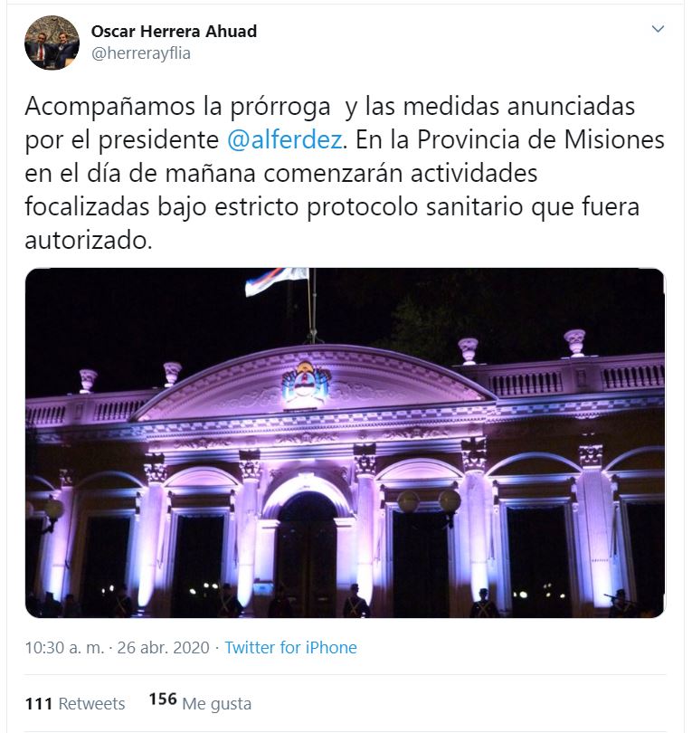 Domingo 26 de abril de 2020. Este lunes se suman, en Misiones, una serie de actividades laborales a las ya permitidas en el marco de la cuarentena obligatoria decretada por el Gobierno argentino a causa de la pandemia de coronavirus. “Conforme a las excepciones solicitadas y aprobadas por la Provincia, mañana se sumarán a las ya permitidas, nuevas actividades focalizadas bajo estricto protocolo sanitario ya autorizado”, informó el Gobierno de Misiones esta noche de domingo.