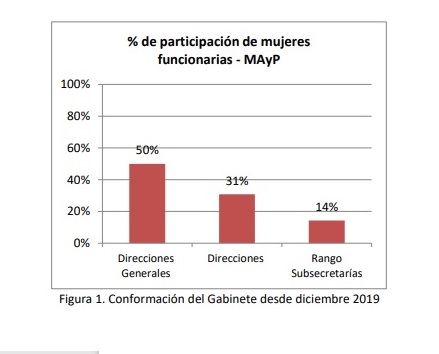 En lo que respecta a la planta jerárquica el número de mujeres en los cargos de Direcciones Generales alcanza el 50% con respecto a sus pares varones. En tanto, en las Direcciones Simples alcanza el 31% de mujeres titulares. Cabe señalar que hay subsecretarías que tienen presencia exclusiva de varones y donde históricamente las mujeres no han tenido participación. También ocurre lo mismo en lugares de toma de decisión y organismos consultivos de articulación institucional y donde muchas veces pasan las decisiones sobre política agraria, donde la participación de mujeres apenas supera el 10%.