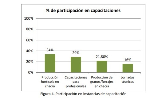 Otro aspecto a señalar vinculado a la cuestión de participación tiene que ver con las instancias de capacitación y el nivel de presencia de las mujeres en las mismas. Se observa una participación de mujeres en las propuestas de formación organizadas desde el Ministerio del Agro y la Producción donde por ejemplo en el caso hortícola la participación alcanza el 34% y en otros casos como las capacitaciones brindadas en el marco del Programa de Producción de Granos, Forrajes y Semillas alcanzan el 21%. Al mismo tiempo, en las instancias de capacitación destinadas a profesionales, por ejemplo en el “Curso de aplicación profesional de agroquímicos” la participación de mujeres alcanza el 30%. Este habilita la discusión en torno a que la participación de las mujeres en general en el ámbito rural (ya sean profesionales, técnicas o productoras) es menor que la de sus pares varones.