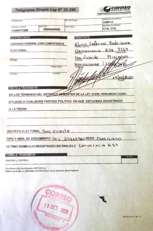 «Renuncio como afiliado a cualquier partido político en que estuviera registrado a la fecha», dice la Carta Documento que Rodríguez remitió al Juzgado Federal con Competencia Electoral.