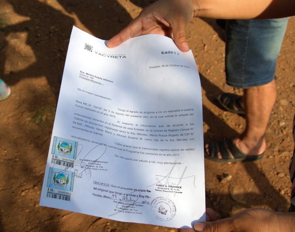 La doctora Ramona Gómez sostuvo que el título del predio donde están asentadas las viviendas es irregular. «La poseedora original de esos terrenos de la Chacra 188 era María Bogado, que fue censada por la Entidad Binacional Yacyretá y antes de morir, cedió informalmente el terreno a uno de sus hijos, Antonio Alfonso, tío de Cecilia», dijo.