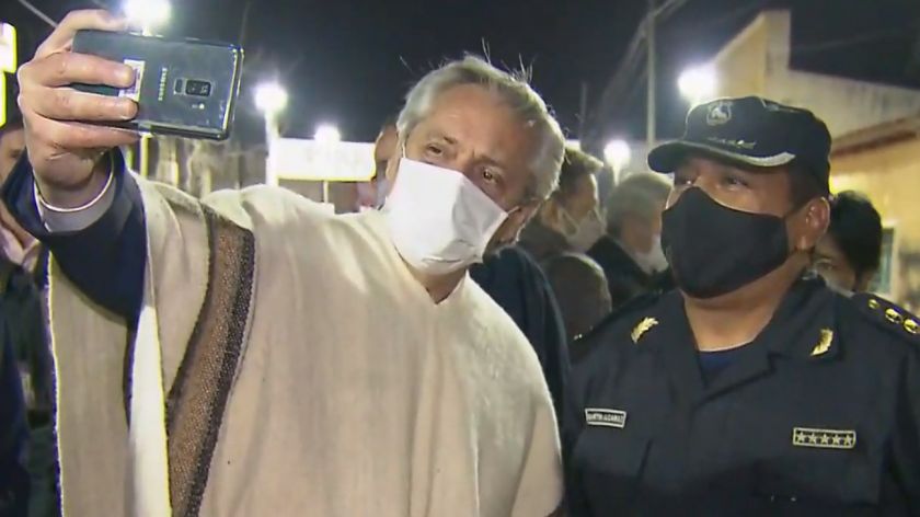 Enfundado en un poncho, y haciendo uso de un barbijo, Fernández se acercó a saludar a las personas que estuvieron esperando su llegada.