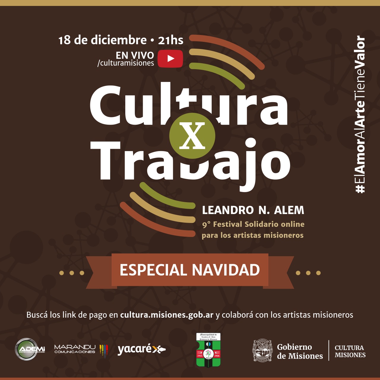 Este viernes a partir de las 21 horas el se llevará adelante el noveno festival «Cultura por x Trabajo», con el cierre del año desde la ciudad de Leandro N. Alem. Se podrá participar vía internet, con la posibilidad de hacer aportes económicos de forma virtual.