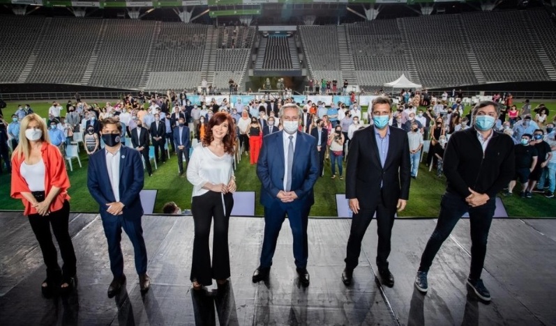 Acompañados en el escenario por Kicillof, Verónica Magario, vicegobernadora bonaerense; Sergio Massa, presidente de la Cámara de Diputados; y Máximo Kirchner, presidente del bloque de diputados del Frente de Todos, Alberto Fernández y Cristina Kirchner hicieron énfasis en el primer año de gestión.