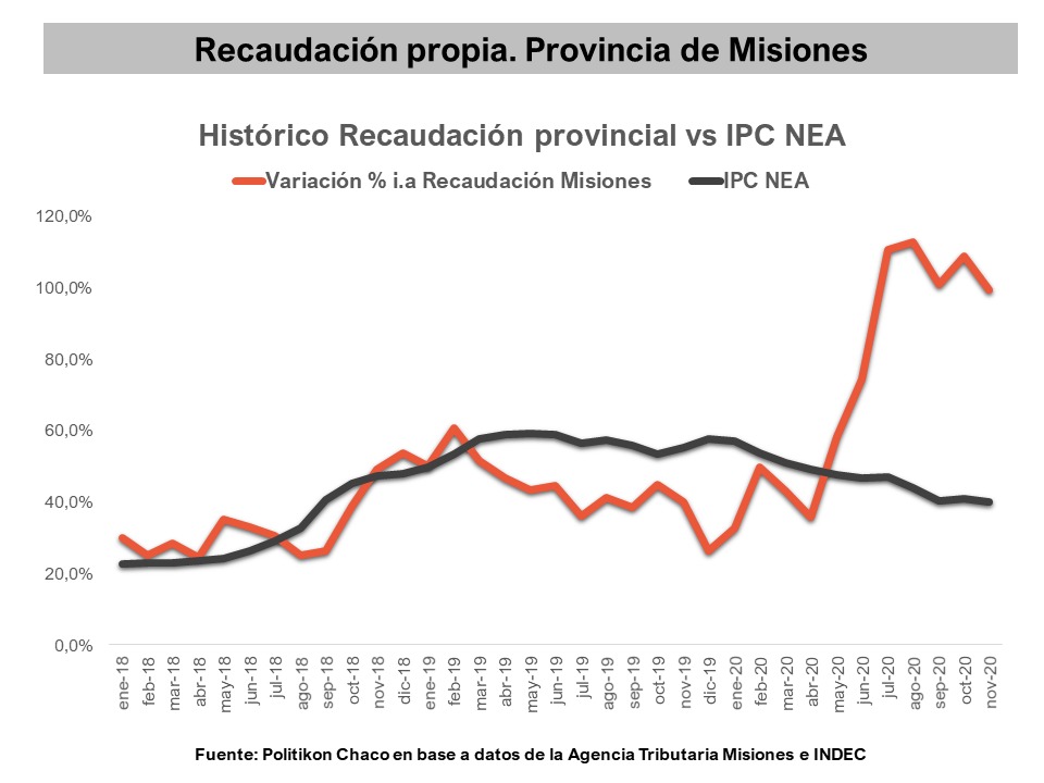 El informe especifica que entre enero y abril de 2020, la recaudación misionera “se movió por debajo del alza de precios para la región del NEA, pero a partir de mayo pegó un salto y hasta el mes de noviembre inclusive, la recaudación le ganó ampliamente a la inflación regional. De hecho, durante cuatro meses consecutivos, la misma tuvo un incremento superior al 100%, tocando su techo en el mes de agosto cuando llegó a ser del 112,6%”.