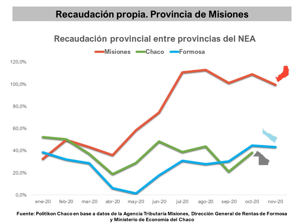 El informe compara el comportamiento misionero con la de las demás provincias del NEA, se observa que “la recaudación en Misiones ha tenido un comportamiento distinto, creciendo a ritmos muy superiores que el resto. En el caso de Formosa registró recién en el mes de noviembre su primer crecimiento real del año, mientras que el Chaco, con datos hasta octubre tuvo varios vaivenes, pero en el acumulado anual se mantiene con caídas reales. No se publica Corrientes porque no dio a conocer sus números de recaudación, pero sabido es que está considerablemente por debajo de Misiones”
