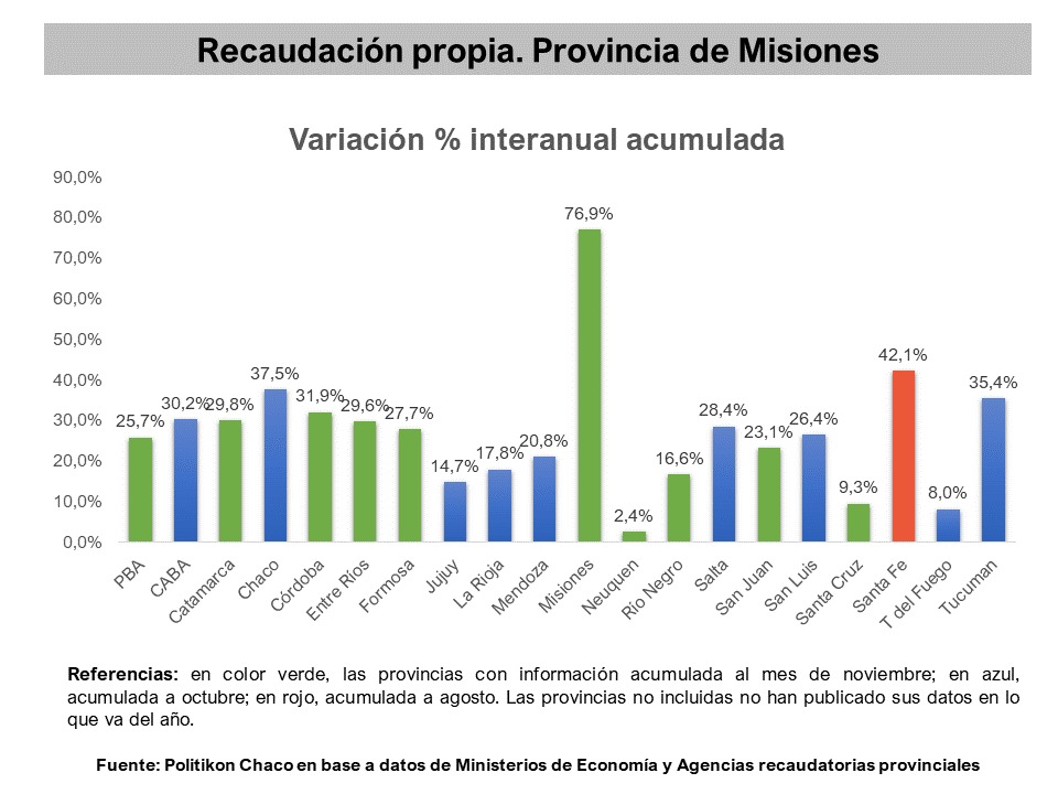 Según un informe publicado por la consultora Politikón Chaco en base a datos de la Agencia Tributaria de Misiones (ATM) “entre el período enero – noviembre del presente año, la provincia recaudó $30.332,6 millones, y crece comparado al mismo período del año anterior un 76,9%, siendo el único distrito del país con dichos niveles de aumento”.