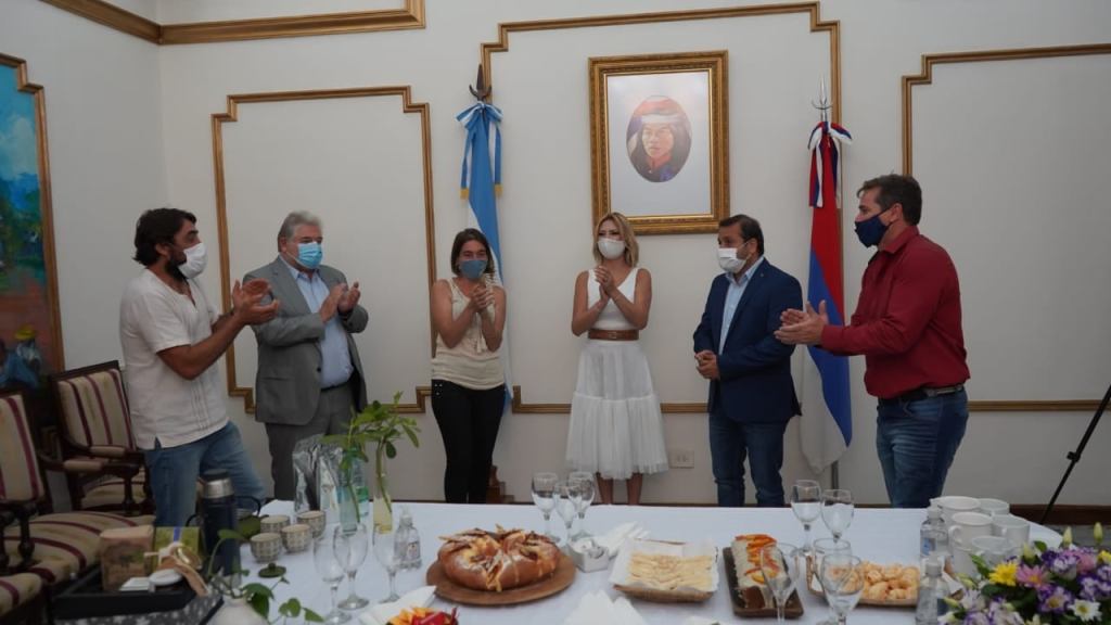 Jueves 7 de enero de 2021 (Prensa de Gobierno). El gobernador Oscar Herrera Ahuad y Fabiola Yáñez, pareja del presidente Alberto Fernández, encabezaron este miércoles el acto de la firma del convenio con la empresa Orígenes Seguros de Retiro SA, empresa que donará 39.950.000 de pesos para la construcción de nuevas instalaciones del IEA 17 del paraje Laguna Azul, en Bernardo de Irigoyen.