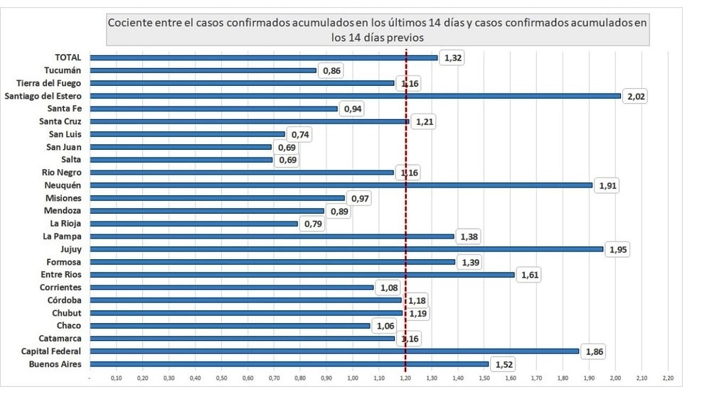 De acuerdo a los gráficos que realiza Aliaga, si solo se aplicara el indicador de razón Tucumán, Tierra del Fuego, Santa Fe, San Juan, San Luis, Salta, Río Negro, Misiones, Mendoza, La Rioja, Corrientes, Córdoba, Chubut, Chaco y Catamarca no deberían establecer nuevas restricciones, porque el cociente (resultado de dividir) entre el número de casos confirmados acumulados en los últimos 14 días y el número de casos confirmados acumulados en los 14 días previos, es inferior a 1,20.
