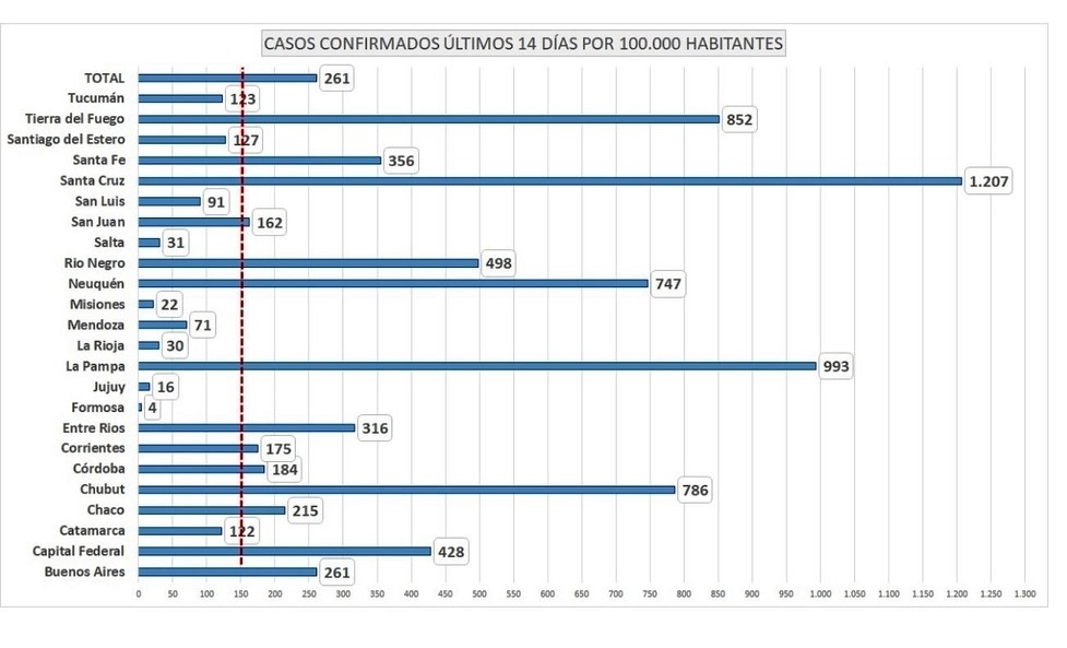 “Desde hace semanas ofrezco un gráfico en mis redes que mide la cantidad de casos cada 100 mil habitantes durante los últimos siete días. A través del decreto, el gobierno propone 14 días y, de nuevo, es indistinto. El foco debe estar en el resultado: el gobierno sugiere 150 casos como corte”, comenta el físico y analista de datos, con un trabajo sobresaliente desde el comienzo de la pandemia. “Para tener como referencia, Alemania propone como indicador 100 casos cada 14 días (o 50 cada 7 que es lo mismo) y España 150 cada 14 días, igual que Argentina, así que no está tan mal respecto de lo que se hace a nivel internacional. Hay que tener en cuenta que CABA, cada 14 días, está en 428 casos y Santa Cruz en 1200, cada 100 mil habitantes”, completa el experto.