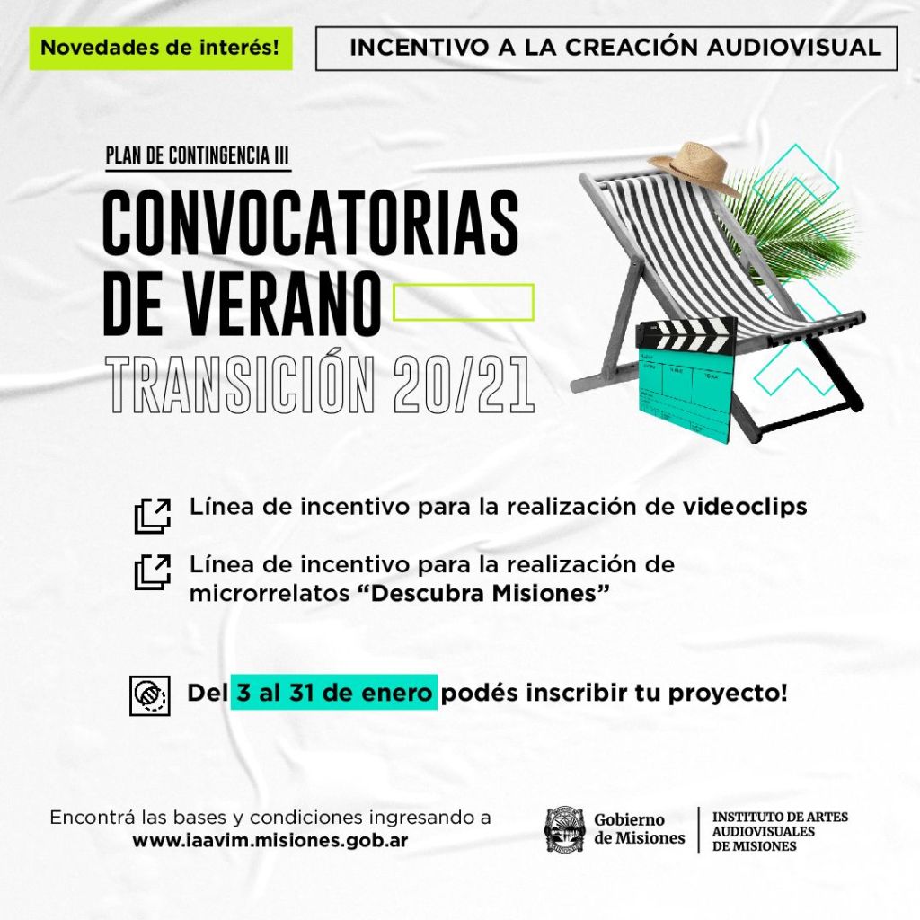 Miércoles, 13 de enero de 2021. Prensa Iaavim. El Instituto de Artes Audiovisuales de Misiones (IAAviM), en el marco la Emergencia Epidemiológica y Sanitaria decretada por el gobierno nacional y provincial, lanza una tercera etapa del “Plan de Contingencia para el Sector Audiovisual de la Provincia de Misiones” denominado “Convocatorias de Verano – Transición 20/21 Incentivo a la Creación Audiovisual”. La convocatoria incluye dos líneas de incentivos, por un lado para la realización de videoclips y por el otro, para la realización de microrrelatos temáticos “Descubra Misiones”.