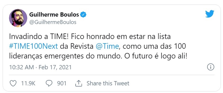 Jueves 18 de febrero de 2021 (DW). La revista estadounidense Time eligió a Guilherme Boulos, líder del Movimiento de Trabajadores sin Hogar (MTST) de Brasil, como uno de los 100 líderes emergentes que están dando forma al futuro. La lista anual, denominada «Time 100 Next», se publicó el miércoles (17/02).