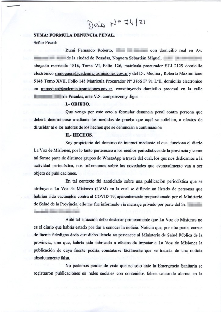 Añaden que “Una fake news con un listado de supuestos vacunados VIP contra el coronavirus en Misiones irrumpió desde anoche en ciertos ámbitos y se viralizó, principalmente vía WhatsApp, en una estrategia hostil contra La Voz de Misiones. Luego de la denuncia formal realizada esta tarde ante la Fiscalía N° 7, a cargo Patricia Clerici, los agentes de Cibercrimen de la Policía de Misiones comenzarían de inmediato a rastrear el origen de la publicación engañosa: “No parece una construcción muy profesional”, anticipó un investigador de esa división que también recibió el viral.
