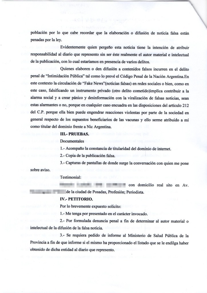 Realizaron la denuncia y esperan que el área de cibercrimen de la policía misionera pueda dar con los responsables de la noticia falsa. «El que ideó esa fake news no sólo pretende perjudicar a los que aparecen en la lista sino también a nuestro medio», dijo el director del portal, Fernando Rumi, a Misiones Plural, cuando anunció que harían la denuncia ante la Justicia.