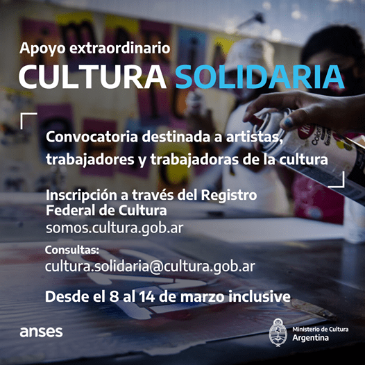 Para aplicar a este Apoyo Extraordinario, los interesados deberán inscribirse en el Registro Federal de Cultura hasta domingo 14 de marzo inclusive. Para consultas, pueden escribir a cultura.solidaria@cultura.gob.ar