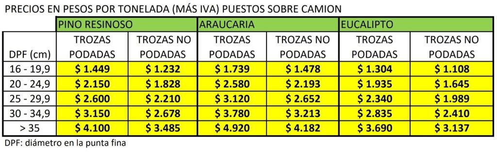 Los precios son para las tres especies más trabajadas en Misiones, que son el Pino resinoso, Araucaria y Eucalipto. Teniendo en cuenta una clasificación basada en el espesor de los rollos (características diamétricas) los precios refieren a la tonelada puesta sobre camión y quedan establecidos como puede verse en el siguiente cuadro: