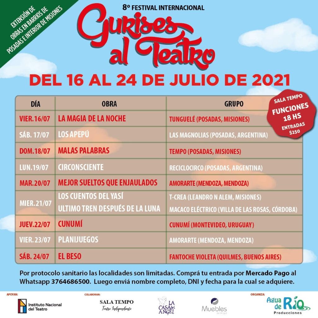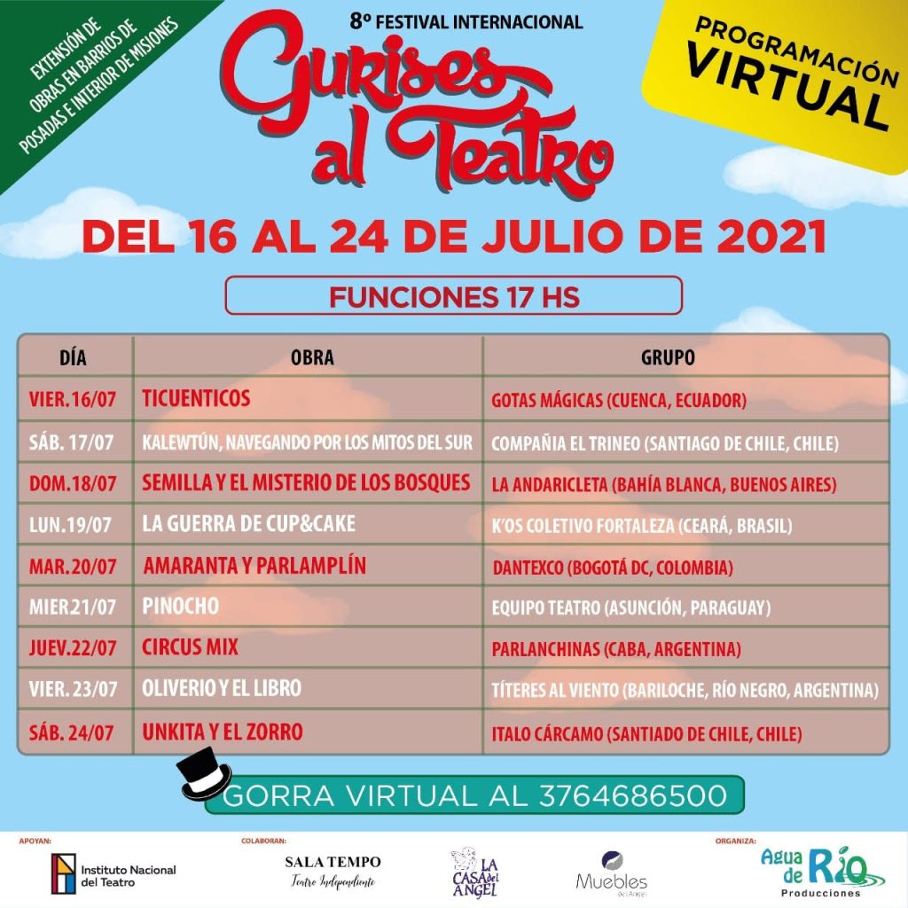 Dadas las circunstancias de aislamiento en que nos encontramos la 8va edición del Festival Gurises al Teatro se realizará de manera mixta, combinando presencialidad (con elencos de Misiones e invitados de otras provincias) y de manera virtual (con elencos internacionales).