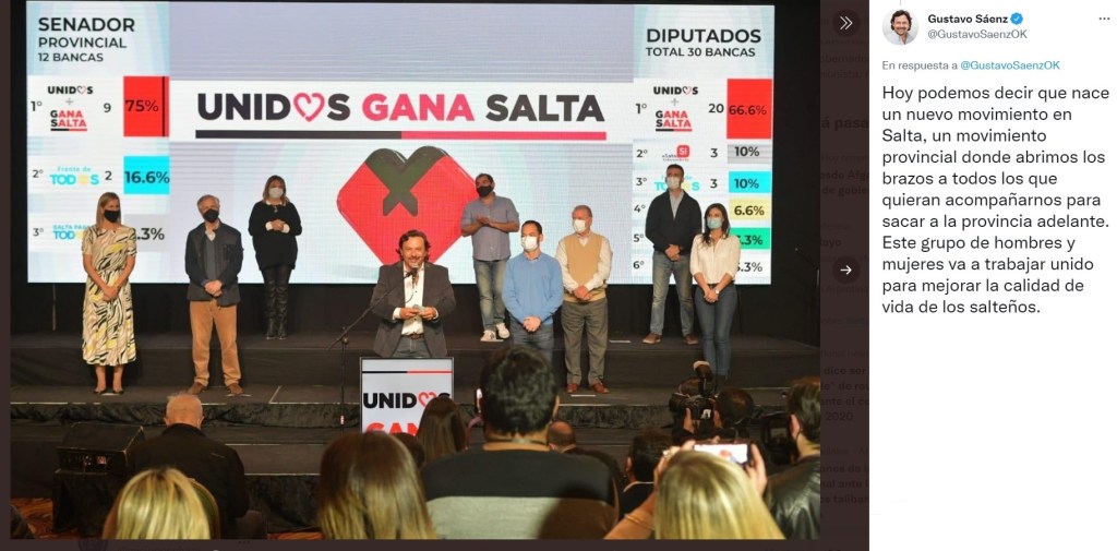 Desde su Twitter, el gobernador Gustavo Sáenz celebró las elecciones en su provincia.