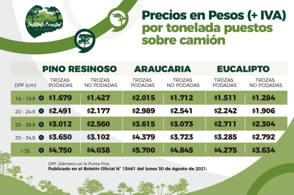 Lunes 30 de agosto de 2021. A partir de su publicación en el Boletín Oficial de la provincia de Misiones, por parte del Instituto Forestal Provincial (Infopro), desde hoy comienza a regir una tabla con precios actualizados para los rollos de madera con destino aserrable o laminable.