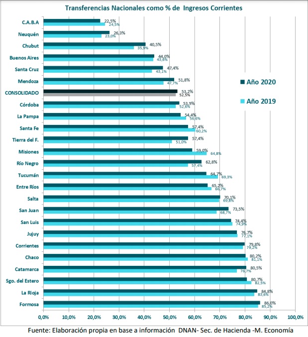 Para el resto de las provincias, las transferencias significan entre el 51 y 66% de sus ingresos corrientes: