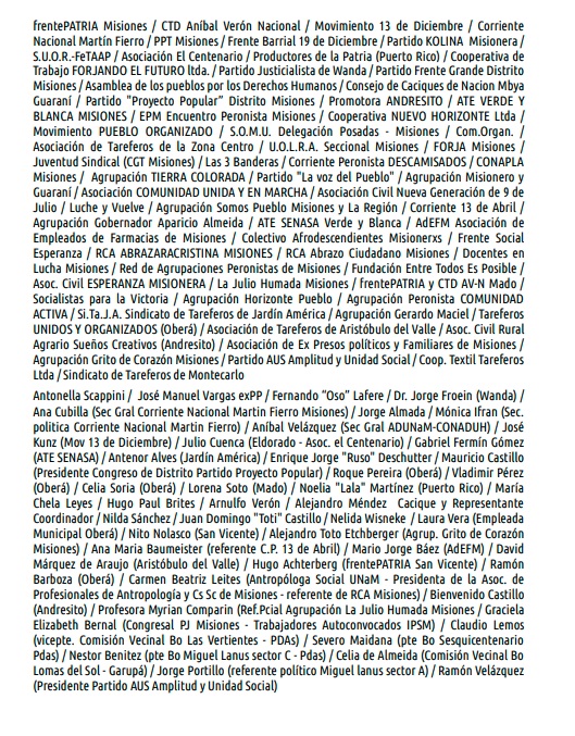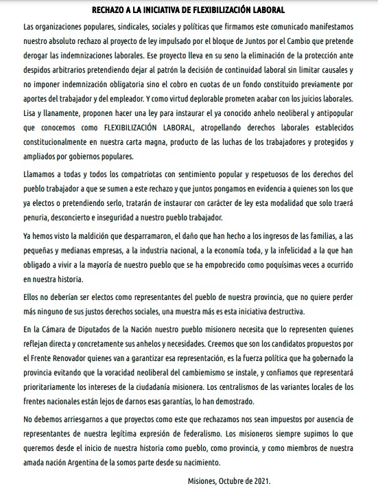 Organizaciones populares, sindicales, sociales y políticas misioneras hicieron público un pronunciamiento que rechaza la iniciativa de flexibilización laboral impulsada por la bancada de Juntos por el Cambio en el Congreso Nacional y hacen un llamado a combatir las políticas antipopulares en los comicios del 14 de noviembre defendiendo los intereses del federalismo.