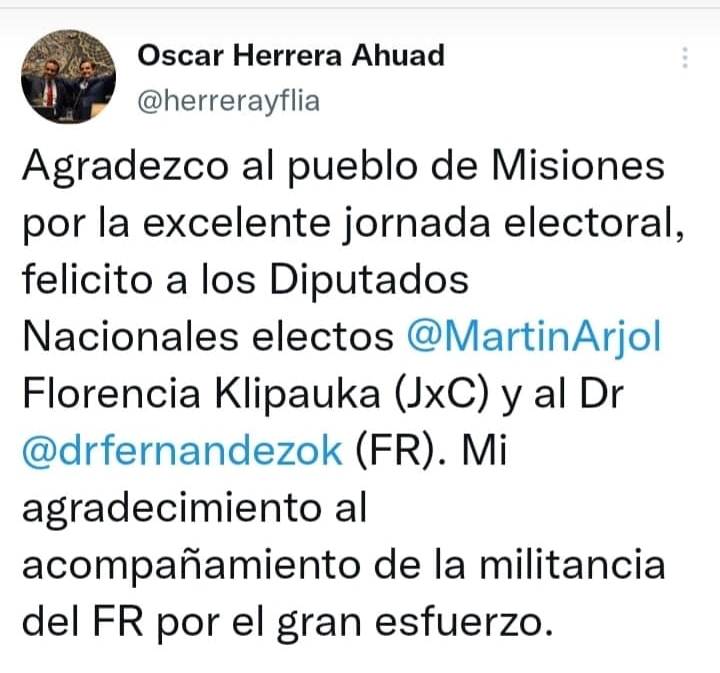 Este domingo, después de conocidos los resultados, el gobernador Herrera Ahuad saludó a los tres ganadores y agradeció a la militancia del Frente Renovador por el esfuerzo que realizaron en el marco de la campaña y las elecciones.