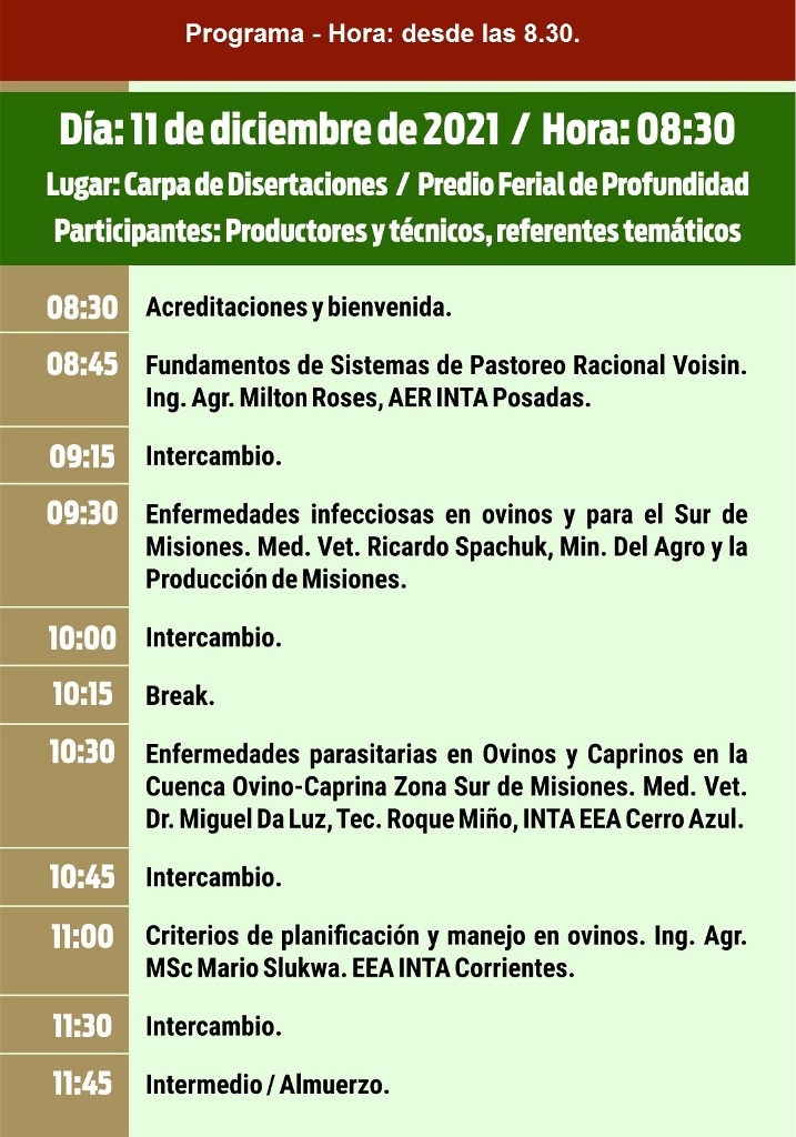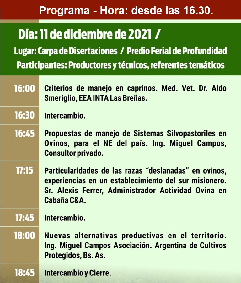 Jueves 9 de diciembre de 2021. La primera exposición de la Cuenca Ovino Caprina de la Zona sur de Misiones tendrá lugar este fin de semana (11 y 12 de diciembre) en el polideportivo de la Municipalidad de Profundidad, con una agenda productiva, social y cultural propuesta por más de 450 familias productoras de la zona, que participarán de capacitaciones y mostrarán su consolidación en producción, agregado de valor sostenible, turismo rural, gastronomía y emprendimientos textiles.