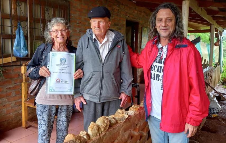 Jueves 14 de abril de 2022 (Prensa de TTT). El 23 de junio, Francisco José «Buby» Somogyi e Hilda «Pepa» Sosa cumplirán 60 años de casados. Ahora con 82 años de edad, y 51 abrazando el anhelo de ser propietarios de su lote ubicado en el Kilómetro 308, en Fracrán, municipio de San Vicente, se sienten felices: es que este martes, su sueño se hizo realidad cuando en el salón comunitario del Paraje San Alfonso, la Subsecretaría de Tierras y Colonización, a cargo de Sonia Melo, y el intendente Fabián Rodrígez (FR), les entregaron su título de propiedad, junto al de otras familias.