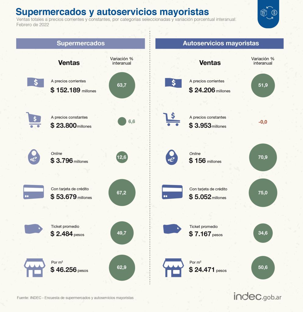 En los supermercados, las ventas a precios corrientes para febrero de 2022 relevadas en la Encuesta de Supermercados sumaron un total de 152.189,3 millones de pesos, lo que representa un incremento de 63,7% respecto al mismo mes del año anterior.