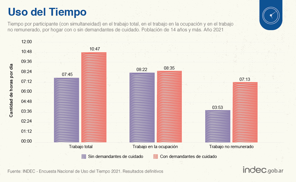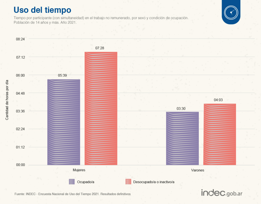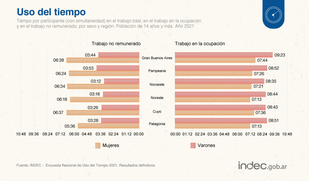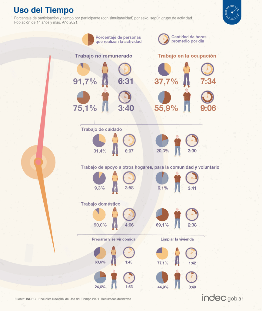 El trabajo publicado por el organismo nacional buscó relevar datos sobre cómo los argentinos distribuyen su tiempo durante el día para las distintas actividades cotidianas, donde los resultados arrojaron marcadas diferencias entre los géneros con respecto al trabajo no remunerado, es decir, el trabajo doméstico no pago, el trabajo de cuidado a miembros del hogar y el trabajo de apoyo a otros hogares (familiares y no familiares), para la comunidad y voluntario.